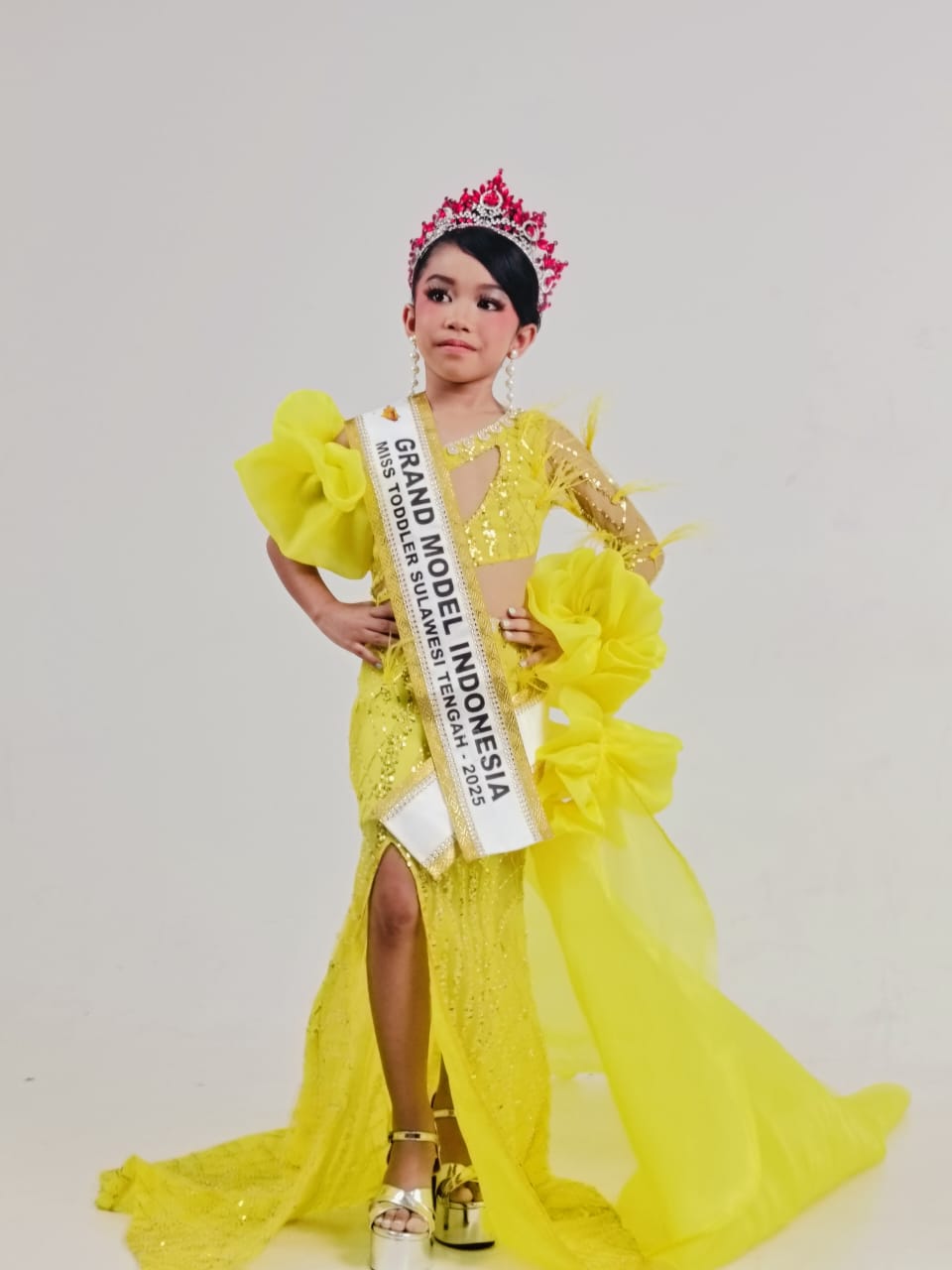 Palu, trustsulteng – Di balik gemerlap gaun kuning dan mahkota yang bertengger anggun di kepalanya, Audrey Aurora Ramadhani berdiri dengan percaya diri. Usianya masih sangat muda. Ia adalah siswi kelas III di SDN Bumi Sagu, Kota Palu. Namun langkahnya telah menembus panggung nasional, membawa nama Sulawesi Tengah dalam ajang Grand Model Indonesia 2026.