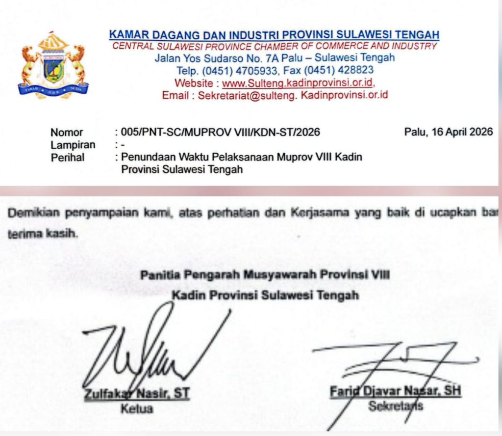 Palu, trustsulteng – Pelaksanaan Musyawarah Provinsi (Muprov) VIII Kamar Dagang dan Industri (Kadin) Sulawesi Tengah resmi ditunda. Keputusan tersebut disampaikan melalui surat panitia yang diterbitkan Steering Committee (SC) Muprov pada Kamis 16 April 2026, pukul 20.00 WITA.